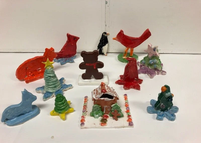 Come use the slab roller to roll slabs of clay to make holiday decorations and gifts! Choices include a luminary, tree, ornaments, candle holders, winter animals and birds, a vase and more. We will make pieces the first week and add color with glaze the second week. Pieces will be available at the beginning of the following week for pick up, after they have been fired a second time.